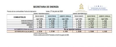 Gasolina superior L21.60, gasolina regular L19.65, keroseno L11.61, diésel L’17.07, LPG vehicular L37.49.