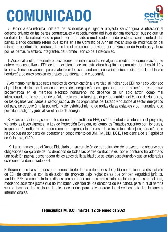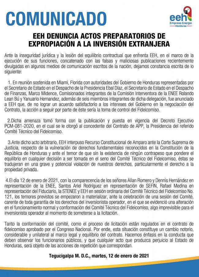 La Empresa de Energía Honduras (EEH) denunció en las últimas horas “actos preparatorios de expropiación a la inversión extranjera” ante la inseguridad jurídica y la lesión del equilibrio contractual que enfrenta la empresa.