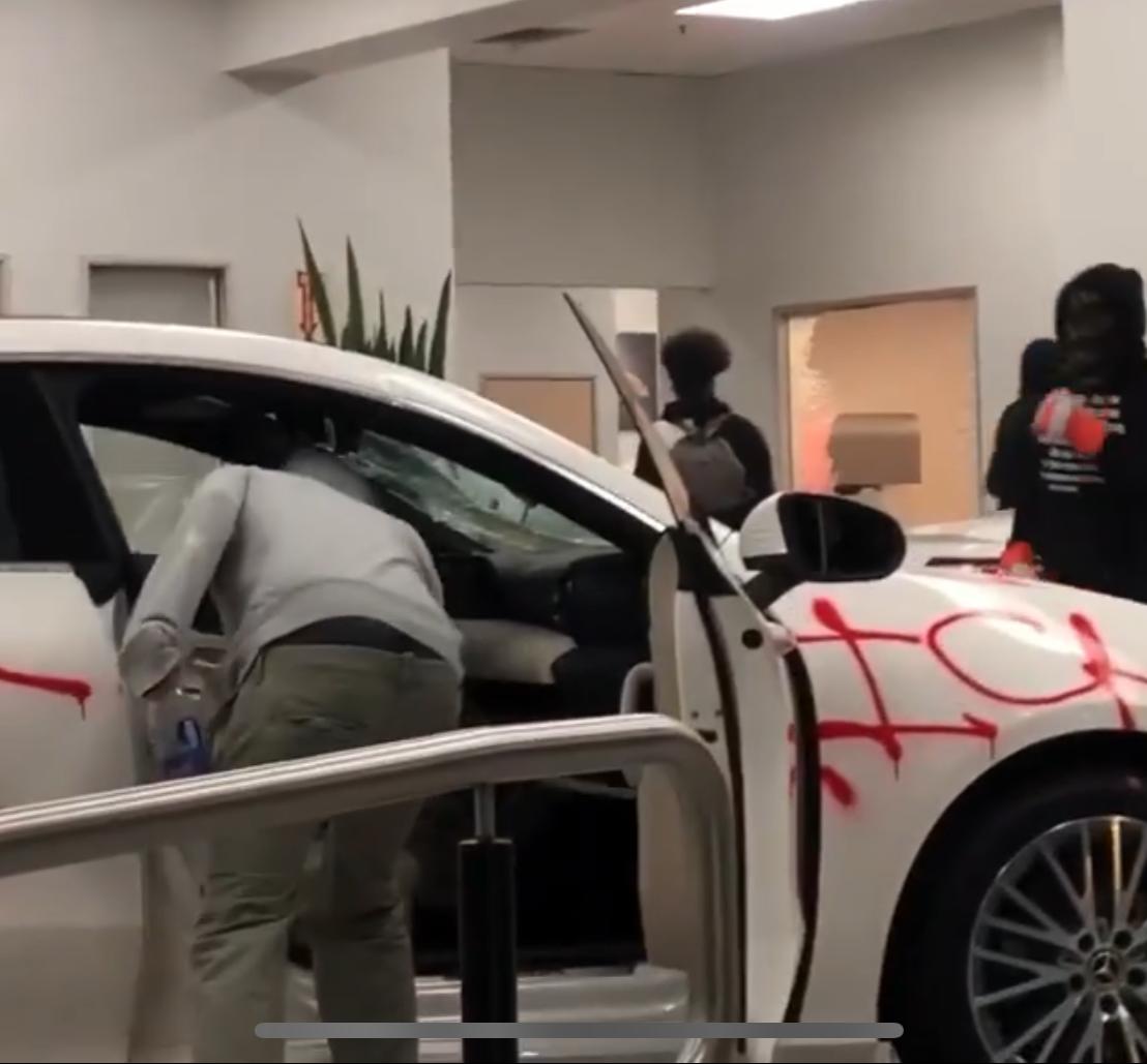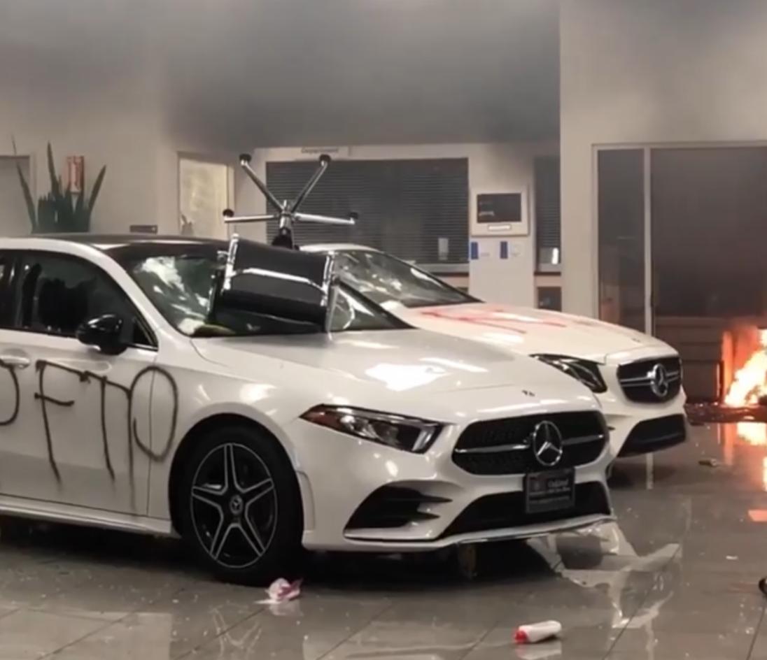 Manifestantes que participaban en las protestas por la muerte del afroamericano George Floyd en Estados Unidos entraron a las instalaciones de una concesionaria de autos Mercedes-Benz en Oakland, California donde dañaron y quemaron varios vehículos de lujo valuados en miles de dólares.