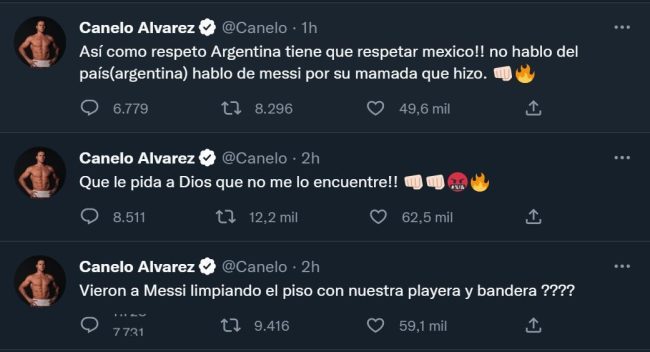 Canelo expresó: “Vieron a Messi limpiando el piso con nuestra playera y bandera” “Así como respeto Argentina tiene que respetar México!!! No hablo del país (Argentina) hablo de Messi por su mamada que hizo” “Que le pida a Dios que no me lo encuentre”