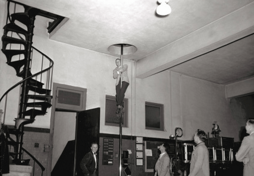 David Kenyon, capitán de la Compañía 21 de la estación de bomberos de Chicago, fue la persona a la que se le ocurrió utilizar un poste que conectara ambas plantas.