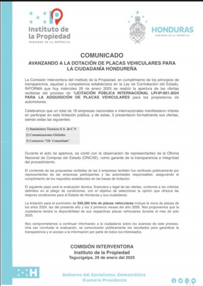 La Comisión Interventora del Instituto de la Propiedad, en cumplimiento de los principios de transparencia, equidad y competencia establecidos en la Ley de Contratación del Estado, INFORMA que hoy miércoles 29 de enero 2025 se realizó la apertura de las ofertas recibidas del proceso de “LICITACIÓN PÚBLICA INTERNACIONAL LPI-IP-001-2024 PARA LA ADQUISICIÓN DE PLACAS VEHICULARES para los propietarios de automotores.