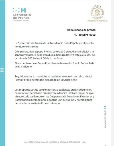 La presidenta de la República Xiomara Castro, será recibida por el Papa Francisco el próximo jueves 20 de octubre del presente año a las 9 de la mañana en una audiencia oficial.