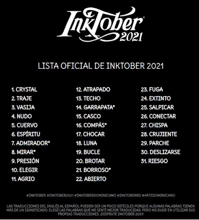 A partir de 2016, Inktober ha tenido una lista oficial con palabras para inspirar tu rutina diaria, te compartimos la de este año: