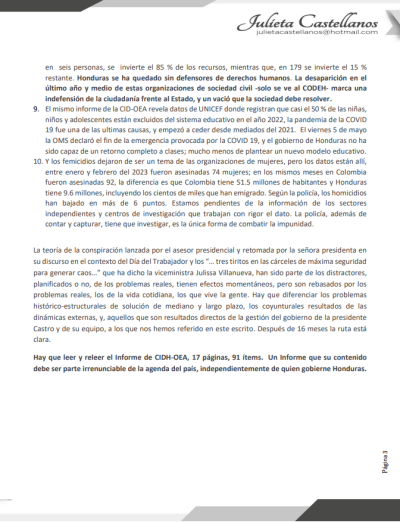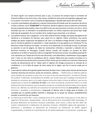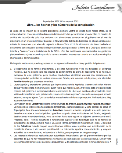 La exrectora de la Universidad Nacional Autónoma de Honduras (UNAH), Julieta Castellanos, publica una carta abierta sobre el gobierno denominada “Libre, los hechos y números de la conspiración”.