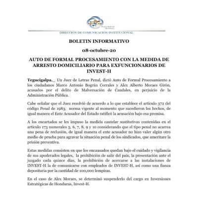 Esto en lo referente al delito de malversación de caudales públicos por el pago de 101 mil lempiras por pagar hospedaje y alimentación en un hotel de lujo para que “pasaran la cuarentena” empleados de Invest-H.