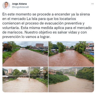 “Se procede a encender ya la sirena en el mercado La Isla para que los locatarios comiencen el proceso de evacuación preventiva y voluntaria. Esta misma medida aplica para el mercado de mariscos. Nuestro objetivo es salvar vidas y con prevención lo vamos a lograr.”, posteó Aldana.
