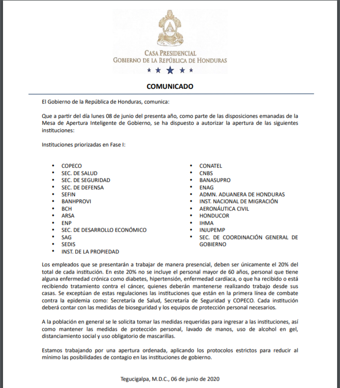 Se exceptúan de estas regulaciones las instituciones que están en la primera linea de combate contra la epidemia como: Secretaria de Salud, Secretaria de Seguridad y COPECO. Cada institución deberá contar con las medidas de bioseguridad y los equipos de protección personal necesarios.