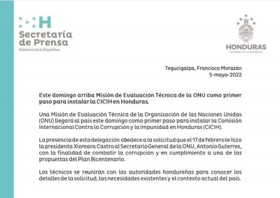 La presencia de esta delegación en el país obedece a la solicitud que el 17 de febrero le hizo la presidenta Xiomara Castro al secretario de la ONU, António Guterres, con la finalidad de combatir la corrupción y en cumplimiento a una de las propuestas del Plan Bicentenario.