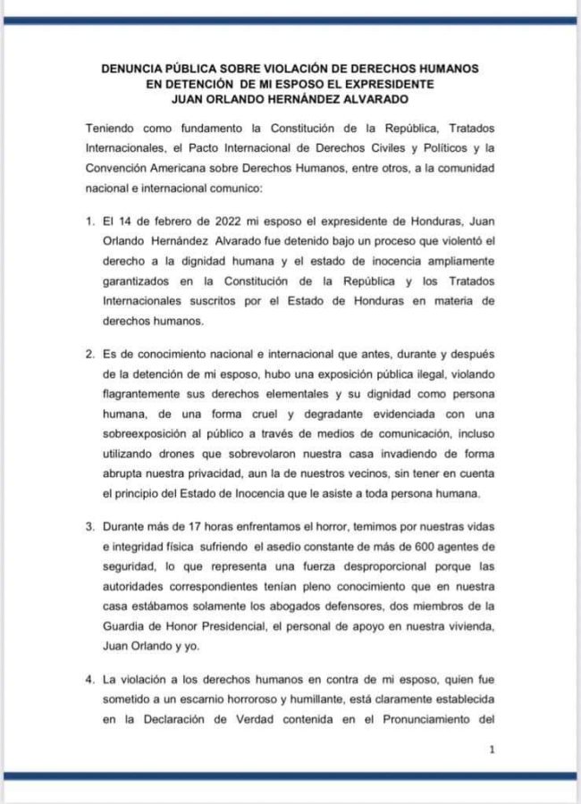 «Es de conocimiento nacional, e internacional que durante y después de la detención de mi esposo, hubo una exposición publica ilegal, violando flagrantemente sus derechos elementales y su dignidad como persona  humana, de una forma cruel y degradante evidenciada como una sobreexposición al publico a través de medios de comunicación , incluso drones que sobrevolaron nuestra casa  invadiendo de forma abrupta nuestra privacidad, aun la de nuestros vecinos, sin tener en cuenta el principio de Estado de Inocencia que le asiste a  toda persona humana» reza el inciso dos del documento.