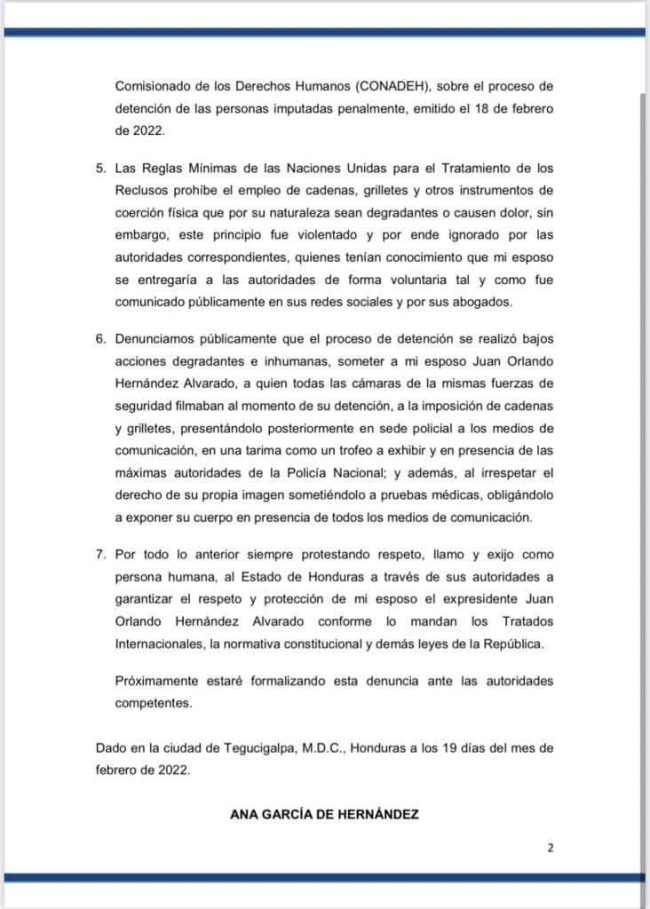 El documento detalla sobre la detención del exmandatario el pasado 14 de febrero del 2022,   el cual  denuncia fue un proceso violento el derecho a la dignidad humana y el estado de inocencia el cual garantiza la constitución de la republica.