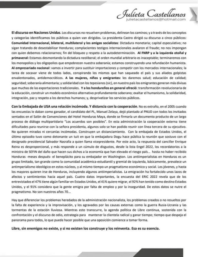 En su carta la exrectora describe varios temas de interés nacional, aparte de la CICIH, se refirió en su misiva a la Alianza Libre – PSH, al reciente discurso de la presidenta Xiomara Castro en la asamblea de Las Naciones Unidas y también a la más reciente controversia con la Embajada de USA, en la que se ha dado un cruce de mensajes de Twitter.