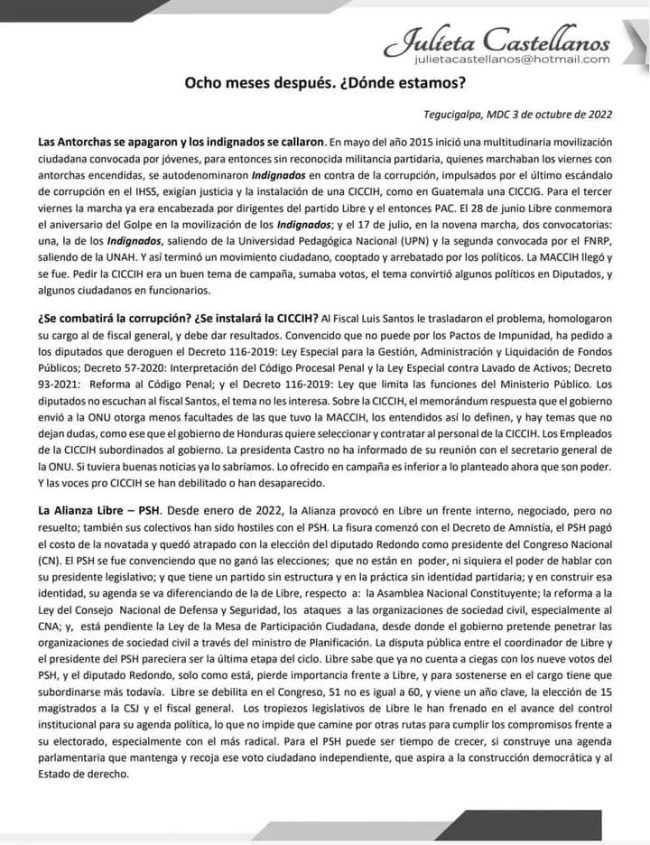 Mediante una carta publica, Castellanos emitió este lunes sobre su opinión respecto a la situación del país y actual gobierno de la presidenta Xiomara Castro, En el escrito la exrectora Castellanos, se refiere al tema de la Comisión Internacional Contra la Impunidad en Honduras (CICIH), del cual dijo que en campaña, fue un buen tema porque sumaba votos, incluso convirtió algunos políticos en diputados, y algunos ciudadanos en funcionarios.