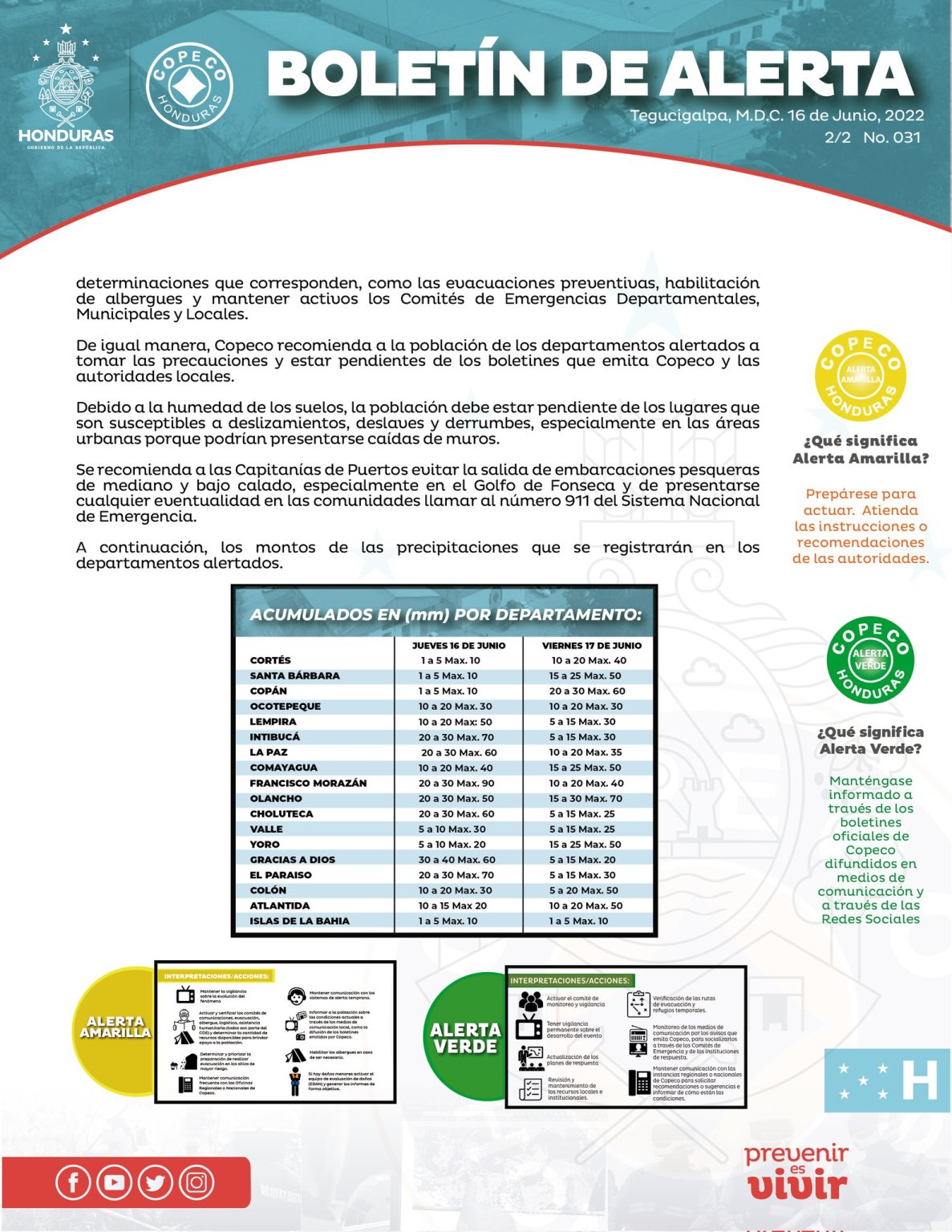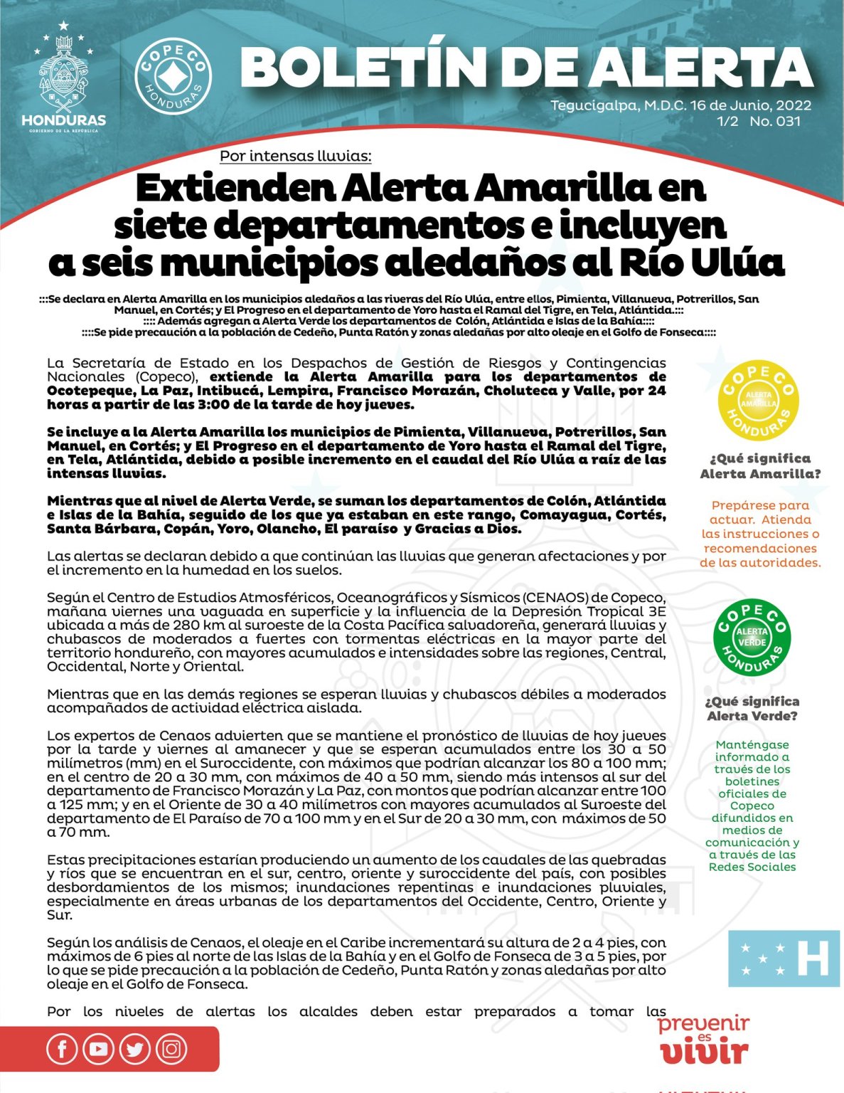 Autoridades de la Comisión Permanente de Contingencias (Copeco) extienden alerta amarilla en siete departamentos y alerta verde en el resto de departamentos del país.