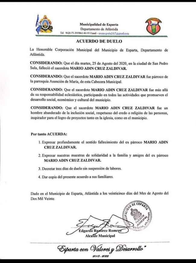 Cruz Zaldivar, fue parroco de la parroquia Asunción de Maria en Esparta, Atlántida, mismos que confirmaron a traves de un comunicado su muerte.