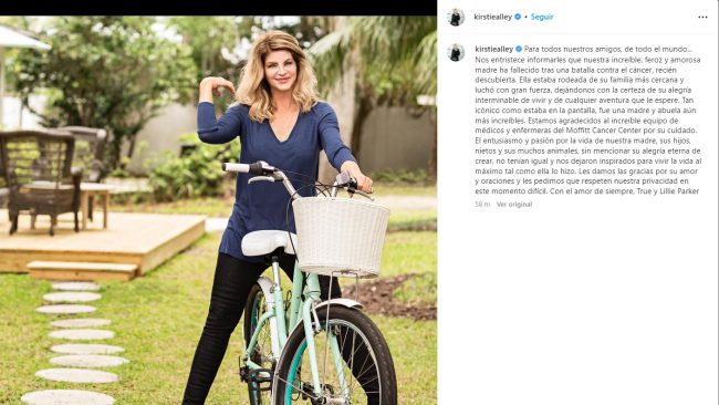“Ella estaba rodeada de su familia más cercana y luchó con gran fuerza, dejándonos con la certeza de su alegría interminable de vivir y de cualquier aventura que le espere. Tan icónica como fue en la pantalla, fue una madre y una abuela aún más increíbles”, añade el texto.