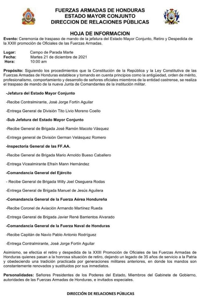 En una tranquila ceremonia, este día, Las fuerzas Armadas de Honduras (FFAA), realizaron en el campo Parada Marte, el traspaso de mando a las nuevas autoridades.