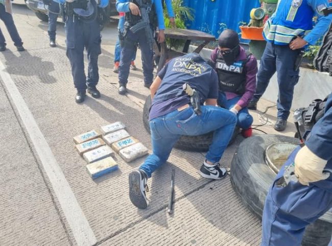 En el puesto de control de El Florido, Copán, agentes de la Dirección Nacional de Servicios Policiales Fronterizos inspeccionaron un vehículo pesado, encontrando en dos llantas de repuesto varios paquetes rectangulares con posible droga.