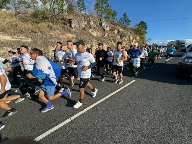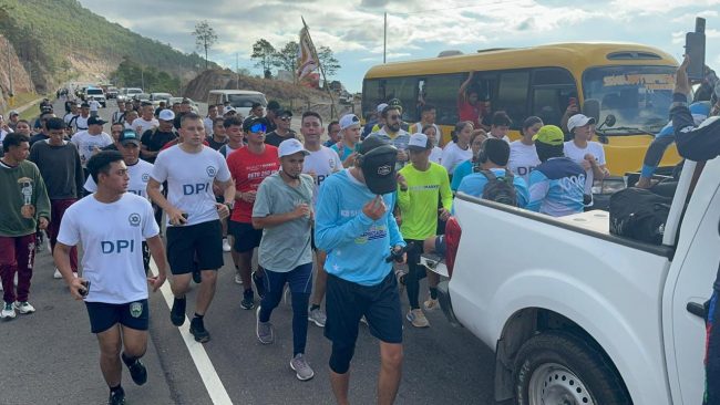 Tegucigalpa. 16 de abril del 2024. Con el propósito de respaldar esta acción solidaria, funcionarios de la Dirección Policial de Investigaciones (DPI), se unen al reconocido Shin Fujiyama en su épica travesía desde San Pedro Sula hasta Tegucigalpa.