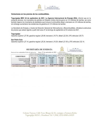 Tegucigalpa. La Secretaría de Energía, a través de Dirección General de Hidrocarburos y Biocombustibles, oficializa la estructura de precios que estará vigente a partir del lunes 27 de septiembre del 2021.