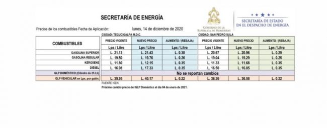 Gasolina superior L20.96, gasolina regular L19.29, keroseno L11.68, diésel L16.85 y LPG vehicular L36.58.