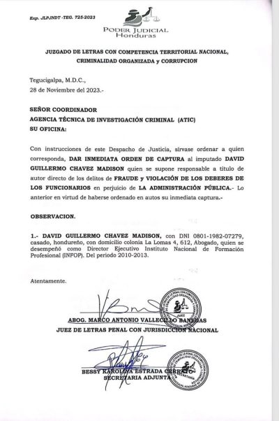 El juzgado de Letras con Jurisdicción Territorial, Criminada Organizada y Corrupción, giró orden de captura contra el presidente del Partido Nacional, David Chávez Madison, confirmó un alto funcionario del Poder Judicial.
