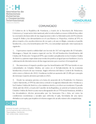 “Expresamos nuestra solidaridad con los más de 337 mil migrantes de El Salvador, Nicaragua y Nepal, de manera especial con los 58 mil hondureños beneficiarios del Estatus de Protección Temporal (TPS), que residen actualmente en los Estados Unidos de América, quienes esperaban una resolución positiva al igual que sus familiares, tras la culminación de dieciséis meses de las negociaciones para resolver el tema judicial”.