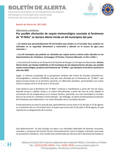 Debido al fenómeno “El Niño”, que afectaría el territorio nacional en este año 2023, la Secretaría de Gestión de Riesgos y Contingencias Nacionales, declara Alerta Verde, por tiempo indefinido en 64 municipios de seis departamentos del país, por posible sequía meteorológica.