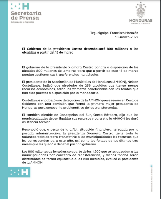 El gobierno de la Presidenta Xiomara Castro, desembolsara 800 millones de lempiras los cuales serán destinados a las alcaldías a partir del próximo 15 de marzo.