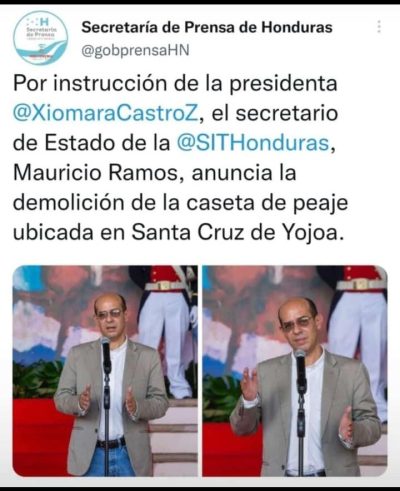 En conferencia de prensa en Casa Presidencial, el ministro de la Secretaría de Infraestructura y Transporte (SIT), Mauricio Ramos, informó que el gobierno instruyó demoler el peaje ubicado en Santa Cruz se Yojoa, Cortés, al norte de Honduras.