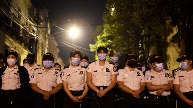 Agentes de policía hacen guardia a las puertas del Congreso de Guatemala, el 8 de marzo de 2022 (Día de la Mujer).