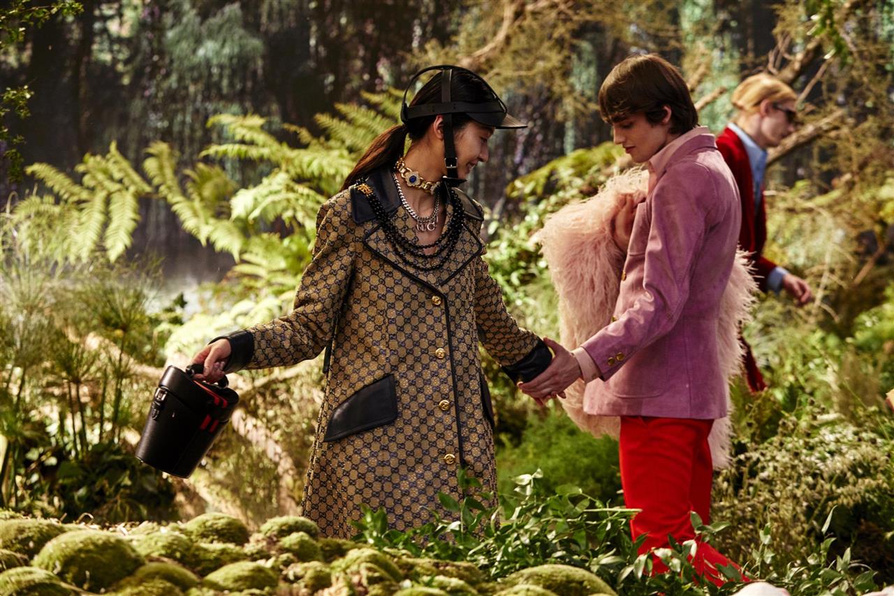 Gucci difundió una imagen en la que una modelo lleva un traje en el que se leen las palabras Gucci y Balenciaga. Foto: Gucci.