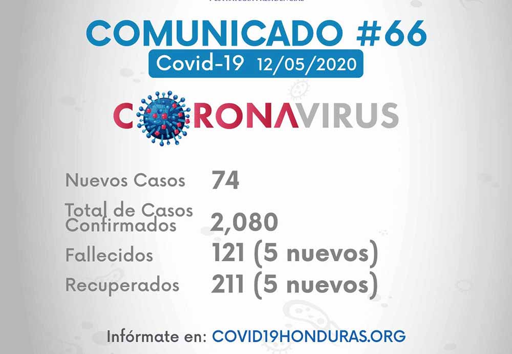 Tegucigalpa/Honduras.- El Sistema Nacional de Gestión de Riesgos (Sinager) anunció hoy que tras realizarse 305 pruebas de covid-19 resultaron positivas 74 para sumar 2.080 casos de esa enfermedad, que causó la muerte de otras cinco personas para totalizar 121 en Honduras.