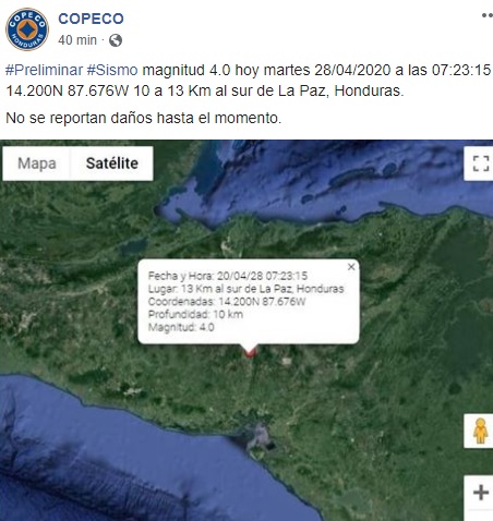 La Comisión Permanente de Contingencias (COPECO) reporto  de forma preliminar  acerca de un sismo registrado  en el territorio hondureño.