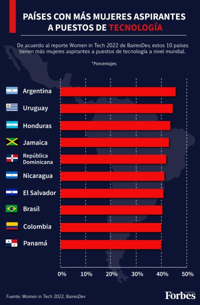 De acuerdo a los reportes publicados por Women in Tech 2022 de BairesDev, entre los 10 primeros países con la mayoría cantidad de mujeres que aspiran a puestos de tecnología a nivel mundial, Honduras se posiciona en el tercer lugar de la lista.