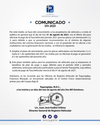 Tegucigalpa, Honduras. El Instituto de la Propiedad (IP) informó en las últimas horas que se extiende hasta hoy el vencimiento en el pago de la matrícula vehicular para las terminaciones 2 y 3.