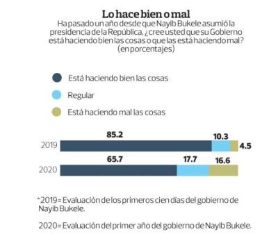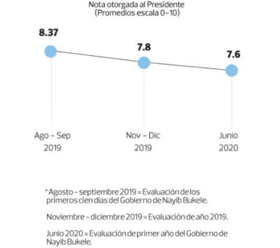 Los salvadoreños otorgaron además una nota de 7.69 al gobierno de Bukele en sus primeros doce meses de gestión, lo cual supone una caída del 8.37 que le dieron en 2019.