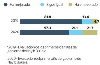 Y pese a que Bukele mantiene una valoración positiva de su imagen en más de la mitad de la población, está en un punto en que, en perspectiva, “ha experimentado una variación claramente desfavorable, ya que en la encuesta de evaluación de sus primeros 100 días el 81.8 % de la población mencionó que la imagen que tenían de Bukele había mejorado, mientras que en el presente sondeo este porcentaje se redujo a un 57.3 %, lo que representa un decremento de cerca de 25 puntos porcentuales”, según el estudio de la UCA.