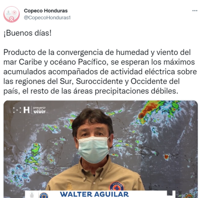 De acuerdo con el pronosticador de turno, Walter Aguilar, producto de la convergencia de humedad y viento del mar Caribe y océano Pacífico, se esperan los máximos acumulados acompañados de actividad eléctrica sobre las regiones del sur, suroccidente y occidente del país, el resto de las áreas precipitaciones débiles.