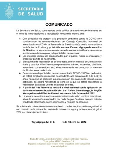 Mediante un comunicado emitido ayer, la Sesal, indicó que la vacunación de refuerzo para ese segmento de la población iniciará en otras partes del país a partir del próximo lunes 7 de febrero.