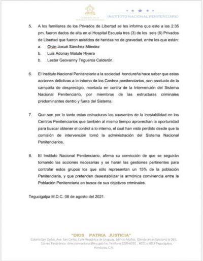 En el escrito del INP no esclarecer más acerca los hechos en el recinto carcelario, solamente manifiesta que los seis heridos no resultaron ser de gravedad y que a las 2:30 de la tarde del sábado, tres de ellos fueron dados de alta en el hospital Escuela de Tegucigalpa.