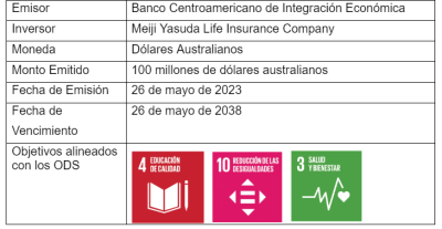 Meiji Yasuda Life Insurance Company y el Banco Centroamericano de Integración Económica anuncian que Meiji Yasuda Life Insurance ha invertido en el primer «Bono Deportivo» del mundo emitido por el BCIE, con el objetivo de apoyar el desarrollo deportivo a través de la educación de los deportistas y la expansión de las instalaciones, mediante la compra del monto total de la emisión por AUD100 millones (aproximadamente 9.1 mil millones de yenes) del Bono. Barclays Securities Japan Limited actuó como único estructurador de la emisión.