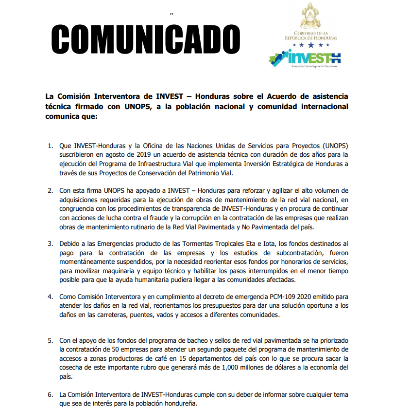 La Comisión Interventora de INVEST –Honduras sobre el Acuerdo de asistencia técnica firmado con UNOPS, a la población nacional y comunidad internacional comunica que: