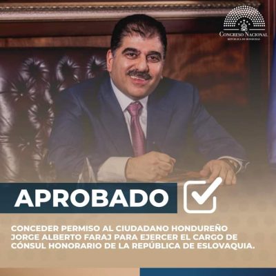 El Congreso Nacional que preside Luis Rolando Redondo Guifarro, concedió permiso al ciudadano hondureño Jorge Alberto Faraj para que pueda ejercer el cargo de cónsul honorario de la República de Eslovaquia.