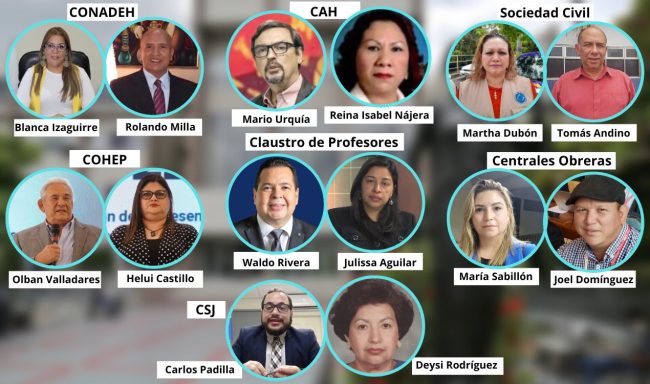 La Junta Nominadora queda integrada por las siguientes personas: Carlos Padilla (Corte Suprema de Justicia – CSJ),  y su suplente, Daisy Rodríguez (CSJ), Mario Urquía (Colegio de Abogados de Honduras – CAH),  y su suplente Reina Nájera (CAH),Blanca Izaguirre (Comisionado Nacional de los Derechos Humanos – Conadeh), y su suplente Rolando Milla (Conadeh),Olban Valladares (Consejo Hondureño de la Empresa Privada – Cohep) y su suplente Helui Castillo (Cohep), Waldo Rivera (Facultades de Ciencias Jurídicas) y su suplente Julissa Aguilar (Facultades de Ciencias Jurídicas),Martha Dubón (sociedad civil) y su suplente Tomás Andino (sociedad civil) y María Elena Sabillón (centrales obreras) con su suplente Joel Almendares (centrales obreras).