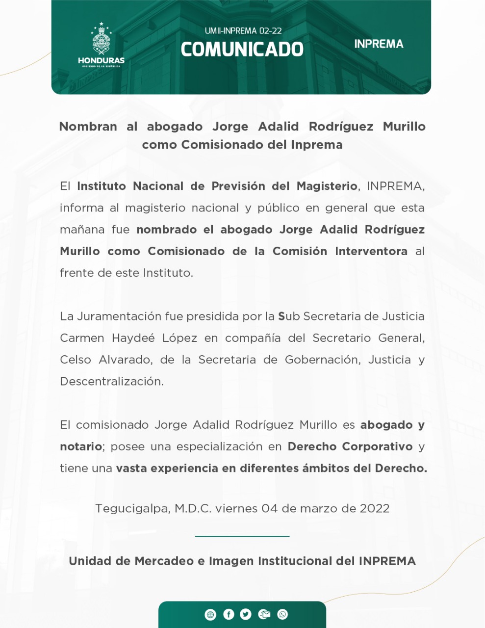 Este viernes 4 de marzo, fue nombrado y juramentado el abogado Jorge Adalid Rodríguez como Comisionado de la Interventora del Instituto de Previsión Magisterial (INPREMA).