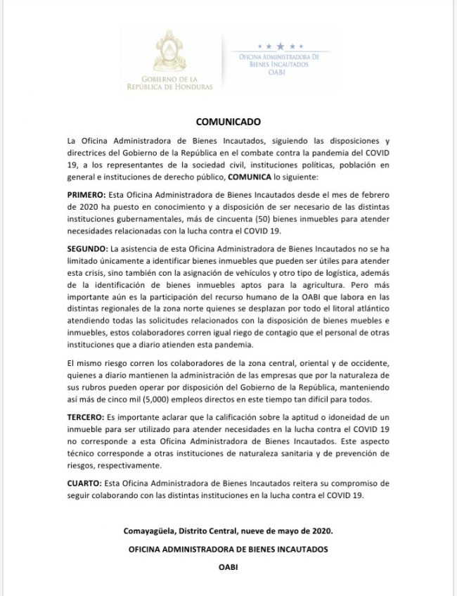 Lo anterior expuesto es en respuesta a la solicitud realizada este día en horas mas tempranas por, el Secretario del Foro Nacional de Convergencia (FONAC) Omar Rivera, quien a través de su cuenta de Twitter recomendó que los bines que han sido incautado y que están bajo la administración de la OABI, como hoteles y otros edificios, sean utilizados para atender a los médicos y enfermeras.