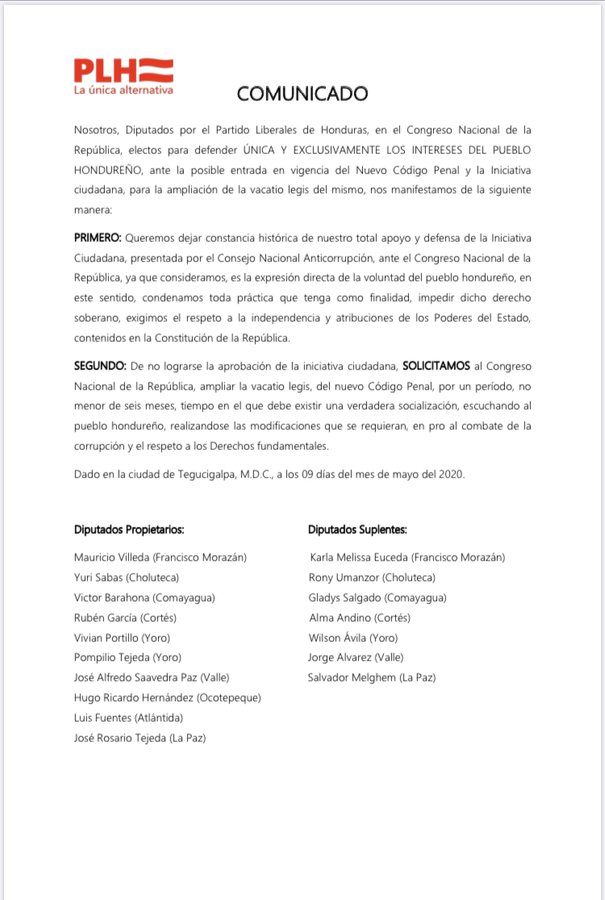 A través de un comunicado, la banda de diputados del Partido Liberal de Honduras (PL), solicito al Congreso Nacional (CN) extender al menos seis meses la vacatio legis, ante la posible entrada en vigencia del Nuevo Código Penal.