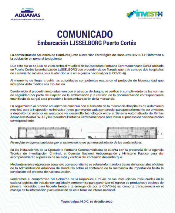 La Administración Aduanera de Honduras junto a Inversión Estratégica de Honduras (INVEST-H) informó mediante comunicado que este viernes 10 de julio arribaron al muelle 6 de la Operadora Portuaria Centroamericana (OPC). ubicada en Puerto Cortés la embarcación LJSSELBORG con procedencia de Turquía que trae consigo dos hospitales de aislamiento móviles para la atención a la emergencia nacional por la COVID-19.