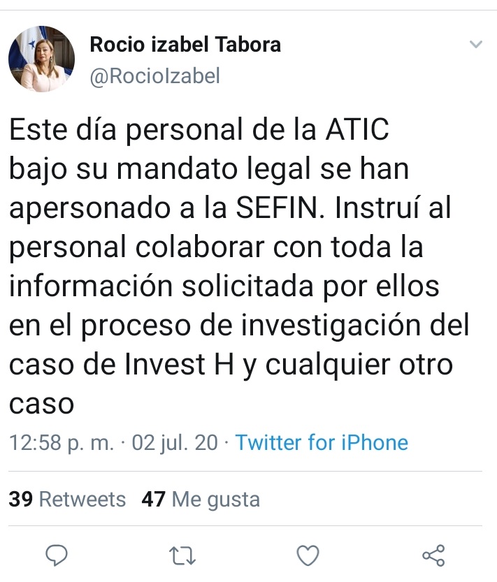 La ministra de Finanzas, Rocío Tábora posteó en su cuenta de twitter que instruyó a sus subalternos para que colaboren con toda la información necesaria para los agentes de la Agencia Técnica de Investigación Criminal (ATIC).